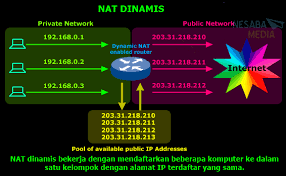 2. Dynamic nat adalah jumlah ip public yang disediakan harus jumlah ip private yang ditranslasikan, dan nat jenis ini jarang digunakan kareana alamat ip yang dialokasikan selalu berubah pada setiap komputer secara dinamis